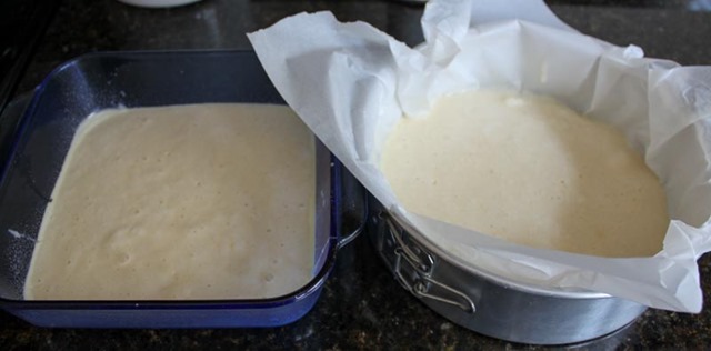 Cut the square cake in half, and then in half again, to get four even strips. Place the cake round back into the springform pan and, with the pan unclipped, place the strips around/abutting the edge of the round.