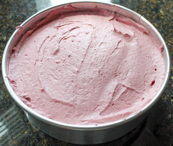 Spoon the raspberry bavarian cream into the chiffon cake mold and smooth over the top to completely cover the cake.