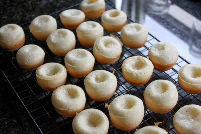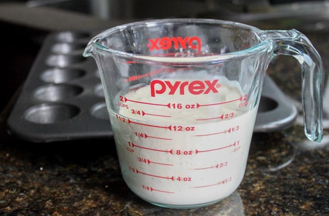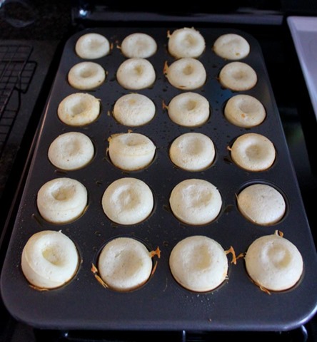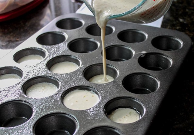 Using a measuring cup that you can pour from, pour the bread batter into each cup in a greased mini muffin pan. Fill up each cup 3/4 way.