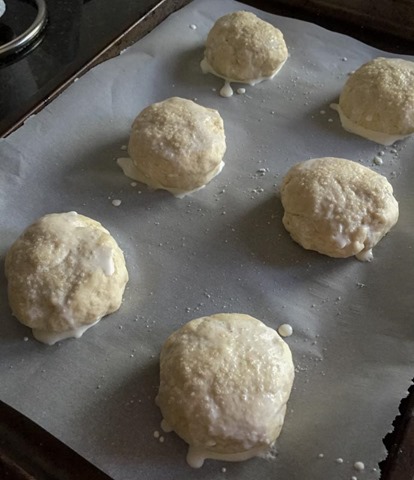 Brush each shortcake with a little cream and sprinkle the top with sugar. Bake on 450 degrees for 10-12 minutes or until the bottoms are brown and the center is cooked.