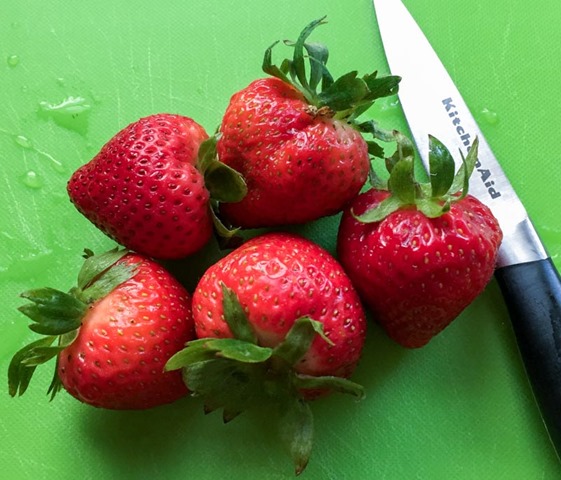 While the shortcakes are baking, rinse and slice the strawberries. The shape and size is up to you!