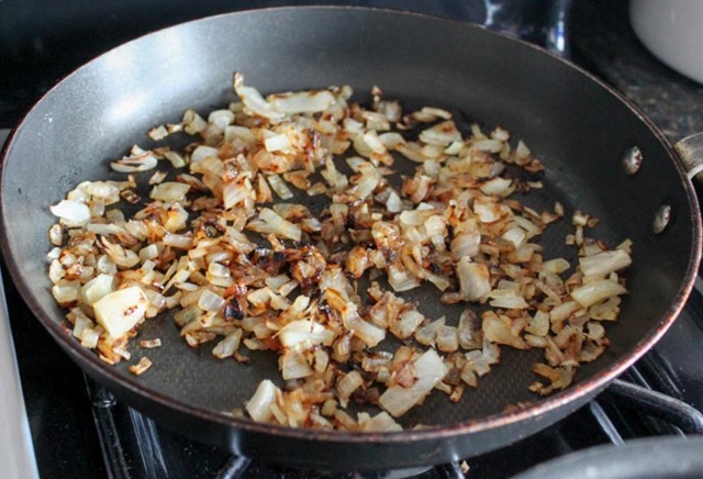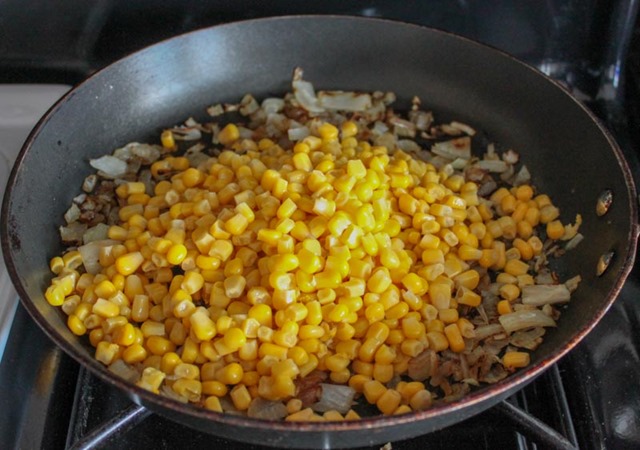 Start by sauteing the onions with a bit of olive oil over medium heat. When they are translucent and the edges have browned, add the corn and the garlic. Season with salt and pepper.