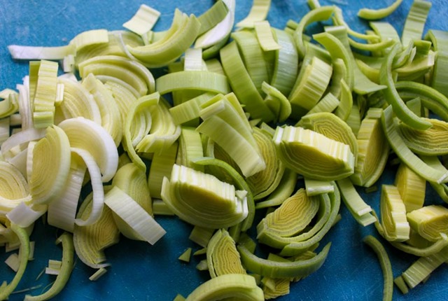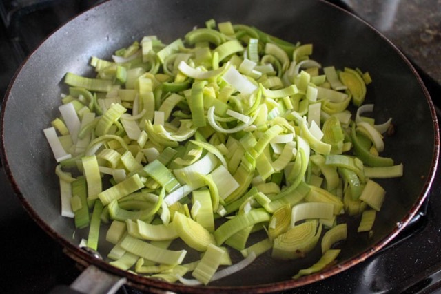 While the onion and corn are cooking, slice the leek into half moons, let sit in a big bowl of cool water for 1-2 minutes so all the grit falls away, drain, and saute in olive oil over medium heat until browned. This can be done in the same pan as the onion/corn, I just have small pans so divided them up.
