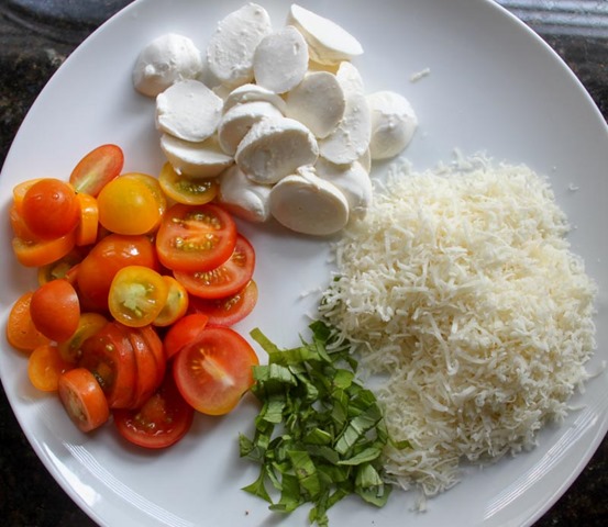 While the dough is proofing, prep the pizza toppings: slice the tomatoes, cut up the mozzarella, grate the parm, and chiffonade the basil.
