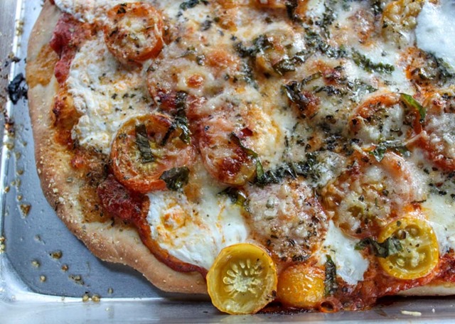 Cool for 5-10 minutes before slicing. Then dig in to this perfect pizza: cheesy, rich with delicious summer tomatoes, and studded with sweet basil. So good, I guarantee you’ll make this over and over.