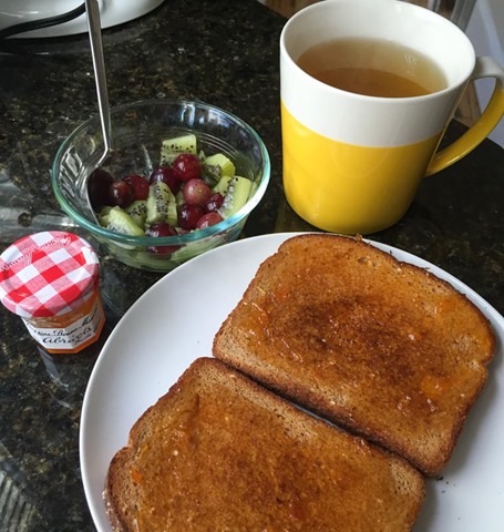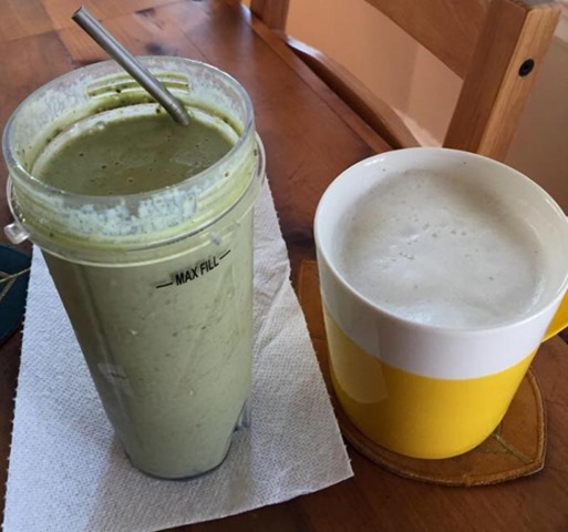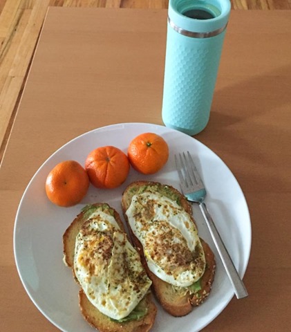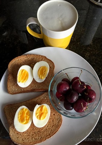 On weekends, or days when I need a smoothie break, I still try to keep the protein high with eggs, peanut butter, and yogurt. I try to have fruits and/or veggies too. And tea, as always (I don’t drink coffee; I’ve never liked it!).