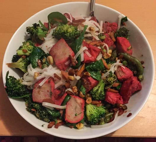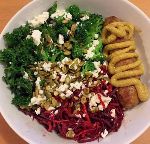 This year I got big into Bowls – basically just a big bowl of stuff that goes really well together. Bowl #1 is basically a salad but full of awesome stuff – spinach, strawberries, red onion, quinoa, avocado, nuts, and an avocado dressing (I was inspired by this recipe). Bowl #2 is spinach, shredded carrot, caramelized onion, grilled pineapple, and brown rice (this recipe was inspired by a meal I had in Dublin). Bowl #3 is massaged kale, broccoli, chicken sausage, beets, pumpkin seeds, and feta (earthy, wholesome, super filling).