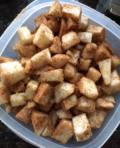 Peel and core the apples. Chop them into cubes. Toss with the cinnamon and sugar, and set aside.