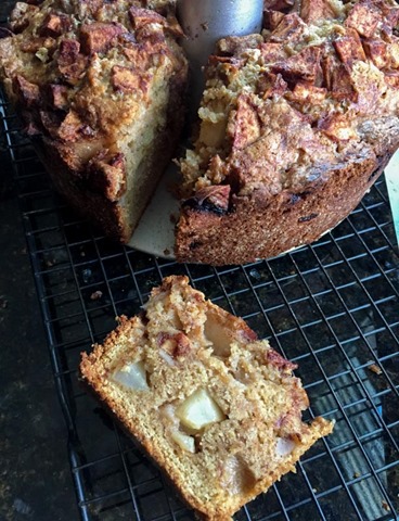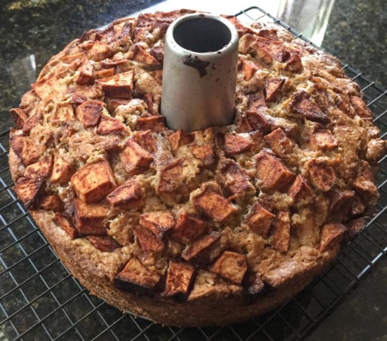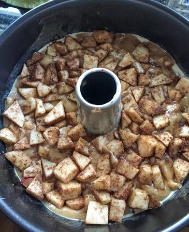 Making the batter is super simple. Using the muffin method, combine all of the dry ingredients in a bowl, combine all of the wet ingredients in another bowl, and then slowly mix the wet into the dry until the batter comes together. When the batter is done, mix in 2/3 of the apples. Pour the apple batter into a liberally greased bundt pan. Spread the remaining 1/3 of the apple mixture over the top of the batter. Bake on 350 for 75 minutes.