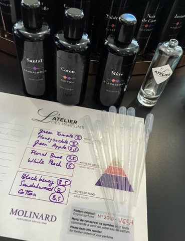 My recipe included top notes of green tomato, honeysuckle, and green apple, heart notes of floral base and white peach, and base notes of blackberry, sandalwood, and cotton.