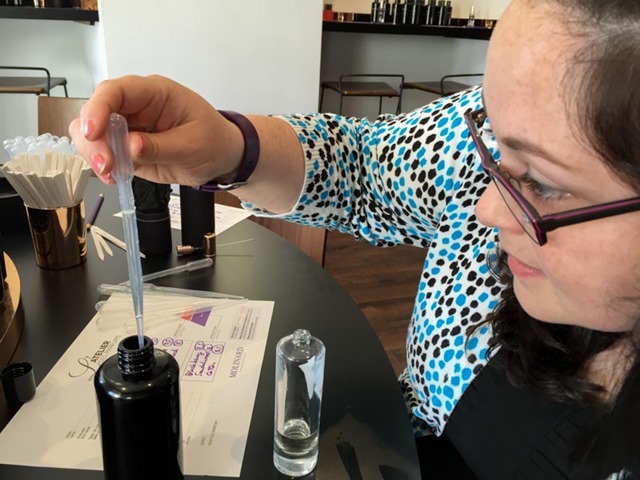 The expert we worked with explained that all of the bottles on the table contained each possible scent we could use – base notes along the bottom, heart notes in the middle, and top notes along the top. The scent science of perfume notes is that the top note is the one you smell first but it doesn’t linger long, the heart note is the one that sits on your heart and wafts up to your nose all day long (so you really need to love this one!), and the base note is the scent you leave behind when you walk through a room. The science behind it all has to do with time of application, evaporation, and the particular groupings of all the various scents in the perfume.