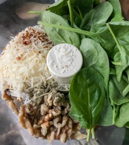 In a food processor, add the spinach, nuts, cheese, and spices. Start with two cloves of garlic and one tbsp. of the garlic oil. Whiz up in the food pro and check the consistency. Add more of the garlic oil until you have a smooth texture. I do this little by little because I don’t like my pesto too oily and once you add too much, you can’t take it back.