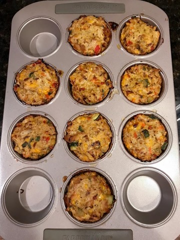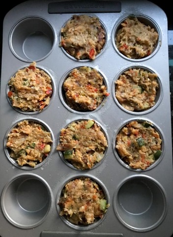 Spray a muffin tin liberally with non-stick spray and fill each cup with the meat mixture. Be sure to press the mixture down into each cup so there are no air pockets. Bake on 375 degrees for about 20 minutes, or until the internal temperature reaches 165 degrees.