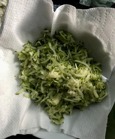 This recipe is pretty simple. The heaviest lift is grating all the zucchini! Once grated, put into a bowl lined with paper towels and let sit for 20 minutes. This will give the zucchini time to give off most of its’ liquid. After 20 minutes, wring out the remaining liquid through the paper towel over the sink.