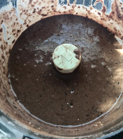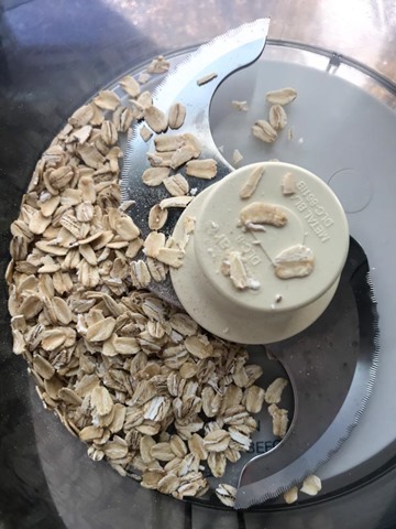 The recipe is quite simple – start by pulsing the oats in a food processor to turn them into oat flour. Then, load the rest of the ingredients into the food pro (except the chocolate chips) and let it rip. When the batter is done, mix in half of the chocolate chips with a spoon.