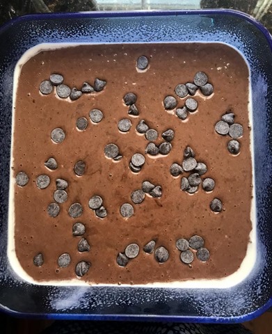 Pour the batter into a greased 8×8 baking pan, sprinkle the remaining chocolate chips over the top, and bake on 350 degrees for 30 minutes.