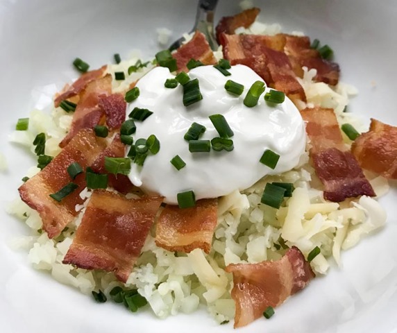 Domestocrat’s Bacon & Cheddar Loaded Cauliflower Bowl (makes one bowl but can easily be scaled up to serve more)