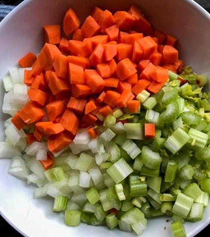 Tip #3: The only veggies you really need in soup are a mirepoix (onion, carrots, and celery). Sure, you can use whatever you want in your soup – peas, corn, squash, peppers, diced tomato, mushrooms, spinach – but for the most classic flavor profile, you just need the trifecta of onion, carrots, and celery. I like to add a few garlic cloves too if I have them on hand but, again, not essential. I give the cloves a good smash, throw them in whole, and fish them out later.