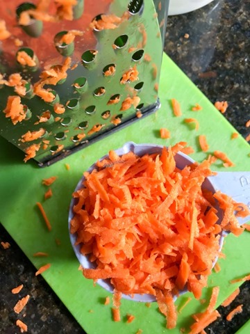 The first step is to shred the carrots. You can use pre-shredded but I think this recipe is so much fresher and brighter with freshly shredded carrots.