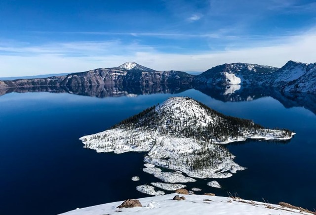 Crater Lake is a caldera lake, which means it was formed from volcanic eruptions that collapsed and formed a depression, or crater. Eventually, rain and snow accumulated and formed a lake. Scientists estimate it took about 720 years to fill the lake to its present depth (almost 2,000 feet). Lava eruptions created a central island – Wizard Island – which is the land mass you see inside the lake. The lake’s deep blue color and water clarity is a result of pristine waters (i.e. very little pollution and almost no microscopic plants), so lots of UV light can get through and reflect back the deep blue color (great article here on this topic).