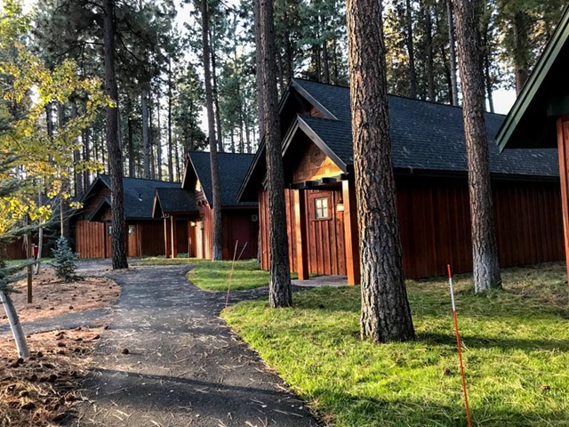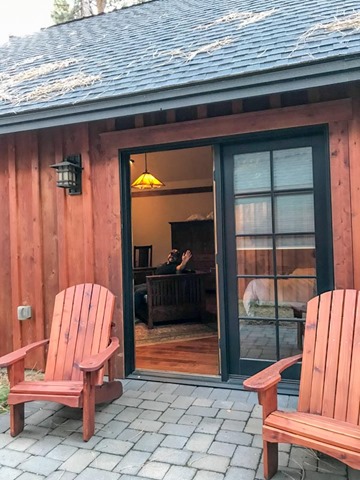 You’re in the woods and they are rustic looking, but the inside has a spa bathroom with a big huge jacuzzi tub, there are comfy kind-sized beds, robes, a huge flat screen tv, a fireplace, and a back patio. It’s my favorite place to stay in the entire world.