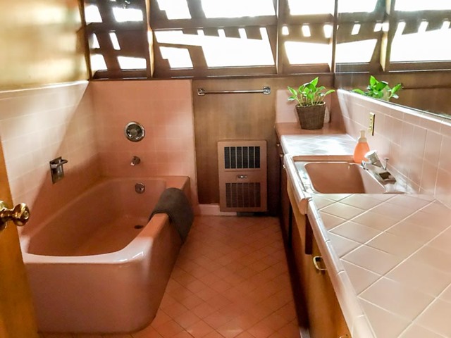 The original kitchen is maintained in its retro style, which I loved. Also kind of obsessed with the dusty rose bathroom.
