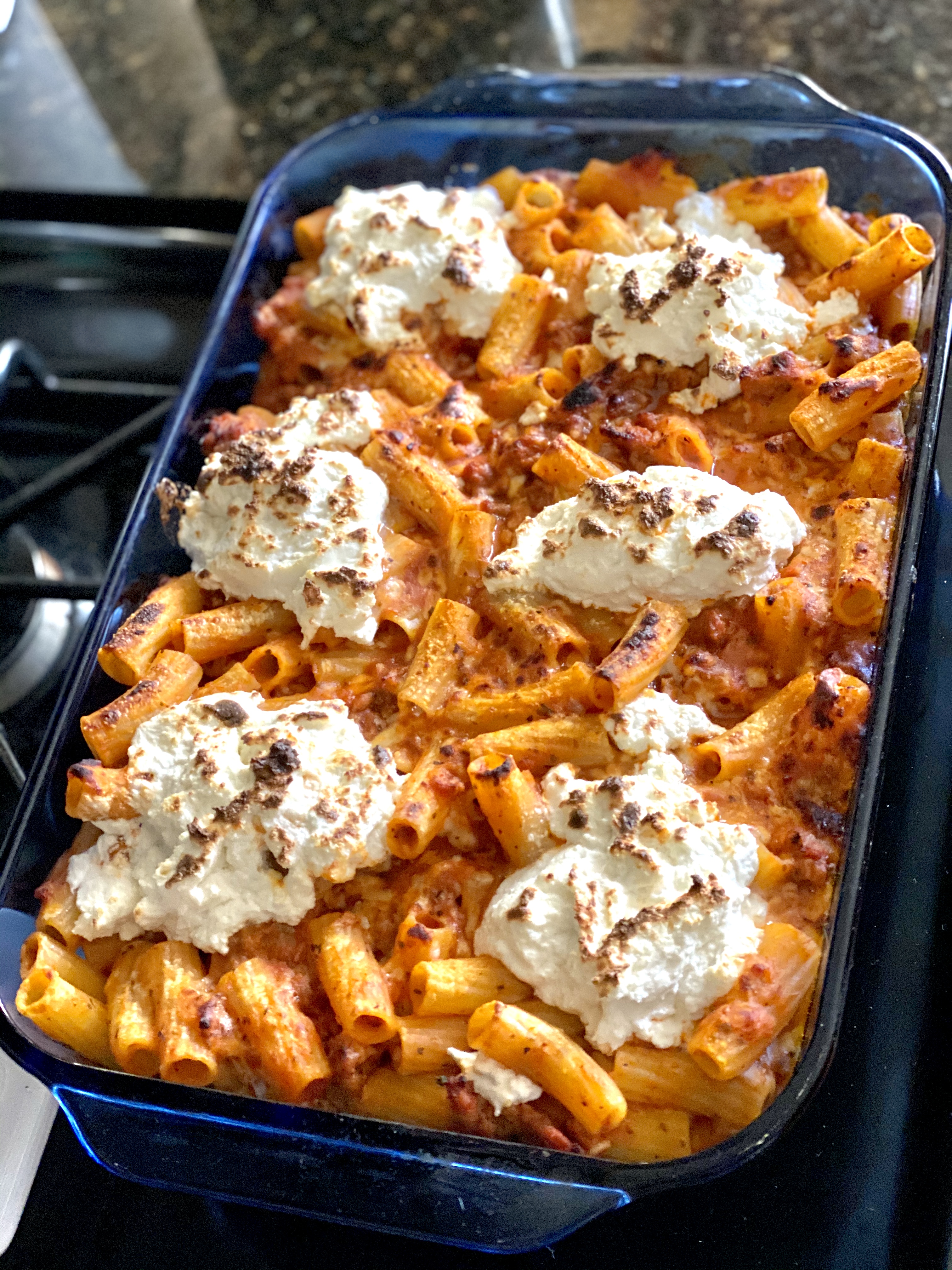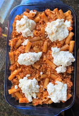 Add the whole mixture to a baking dish and bake on 350 degrees for 10-15 minutes (until the mozzarella cheese has melted). Take out of the oven, dollop the ricotta all over the top, and broil for 3-5 minutes until golden brown on top.